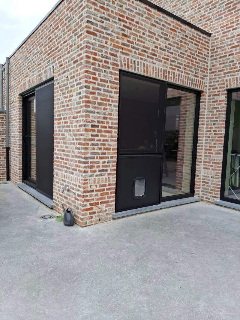 Dubbele vliegenschuifdeur voorzien van petgaas, en 2 verticale S-grepen. Huisdiervriendelijk.